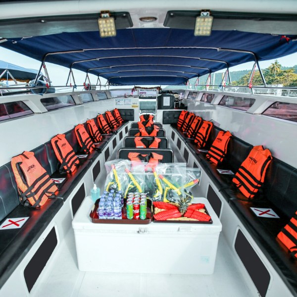 The speed boat holds 20-40 passengers but runs half-full most days. You’ll get soft drinks (water, Coke, Sprite) and a fruit plate (watermelon and pineapple). The boat has a covered roof area for shade.